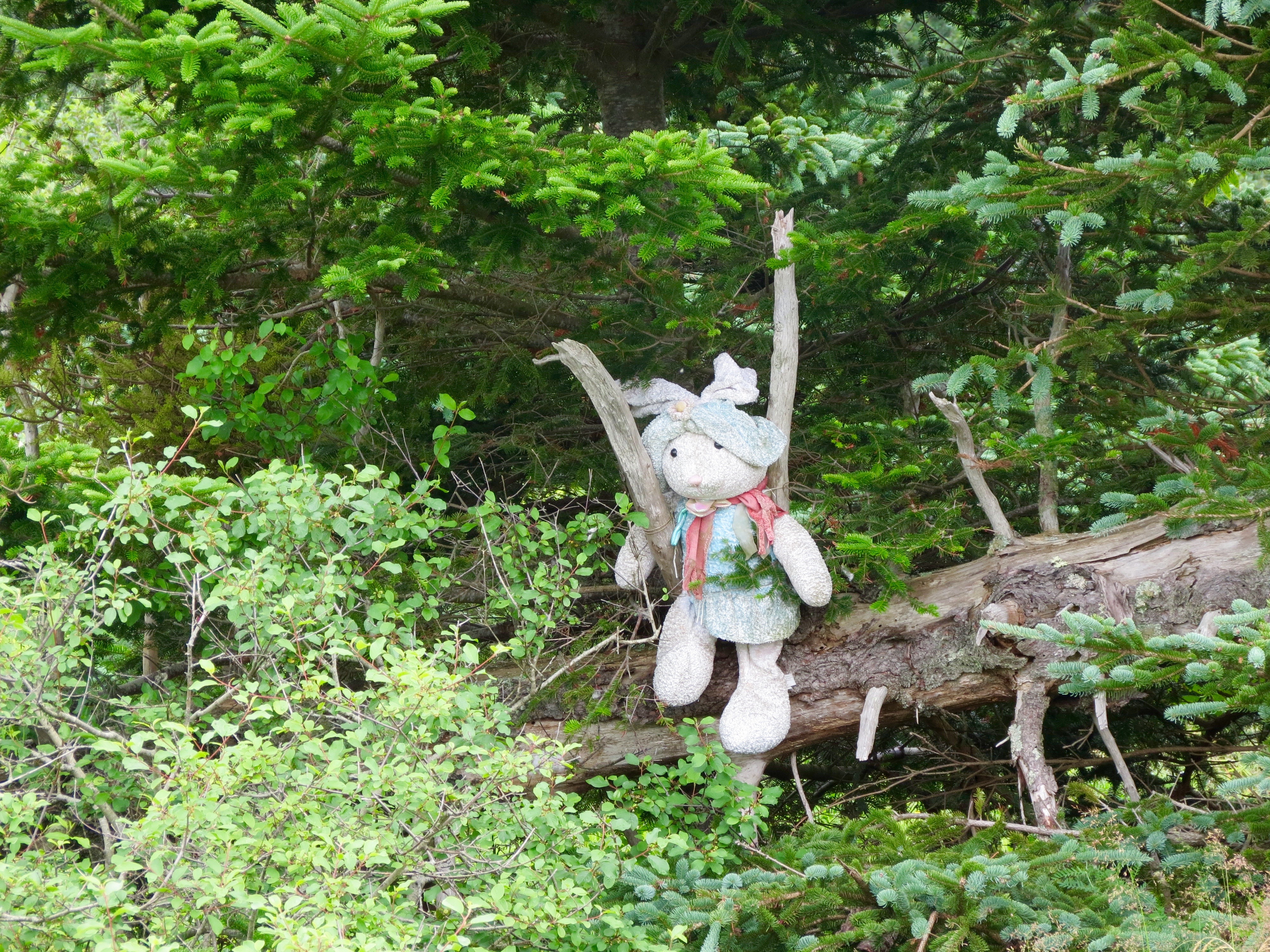 Now Janet and I are on our own. We are settling back into the routine of stopping once a day so I can go outside, somewhere where it is quiet. When we stopped today a funny critter watched us. It didn’t move at all. I think it was a stuffed rabbit. It was just hanging in the trees.
